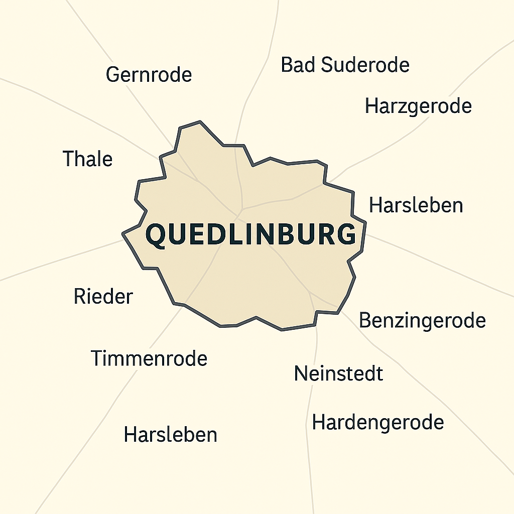 Wir sind nicht nur in Quedlinburg (06484) für Sie da, sondern auch in der Umgebung, z. B. inGernrode (06507), Bad Suderode (06507), Thale (06502), Blankenburg (38889), Rieder (06484) und Ballenstedt (06493).